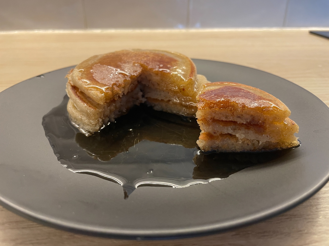 Felmelegítünk (otthon 6os fokozat) és beolajozunk egy teflon serpenyőt. A tésztakeverékből 2-3 korongot csorgatunk bele. Aranybarnára sütjük mindkét oldalát.